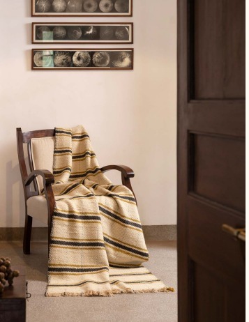 Description: Woven using slubby local sheep wool in the northern region of India, The Bronne throw is a luxurious throw with stripes in mustard and charcoal. With a regular bold stripe design, this throw is hand brushed for a softer handfeel.