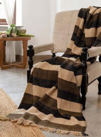 Description: Woven using slubby local sheep wool in the northern region of India, The Maypole throw is a luxurious throw with stripes in natural, soil and charcoal. With a regular bold stripe design, this throw is hand brushed