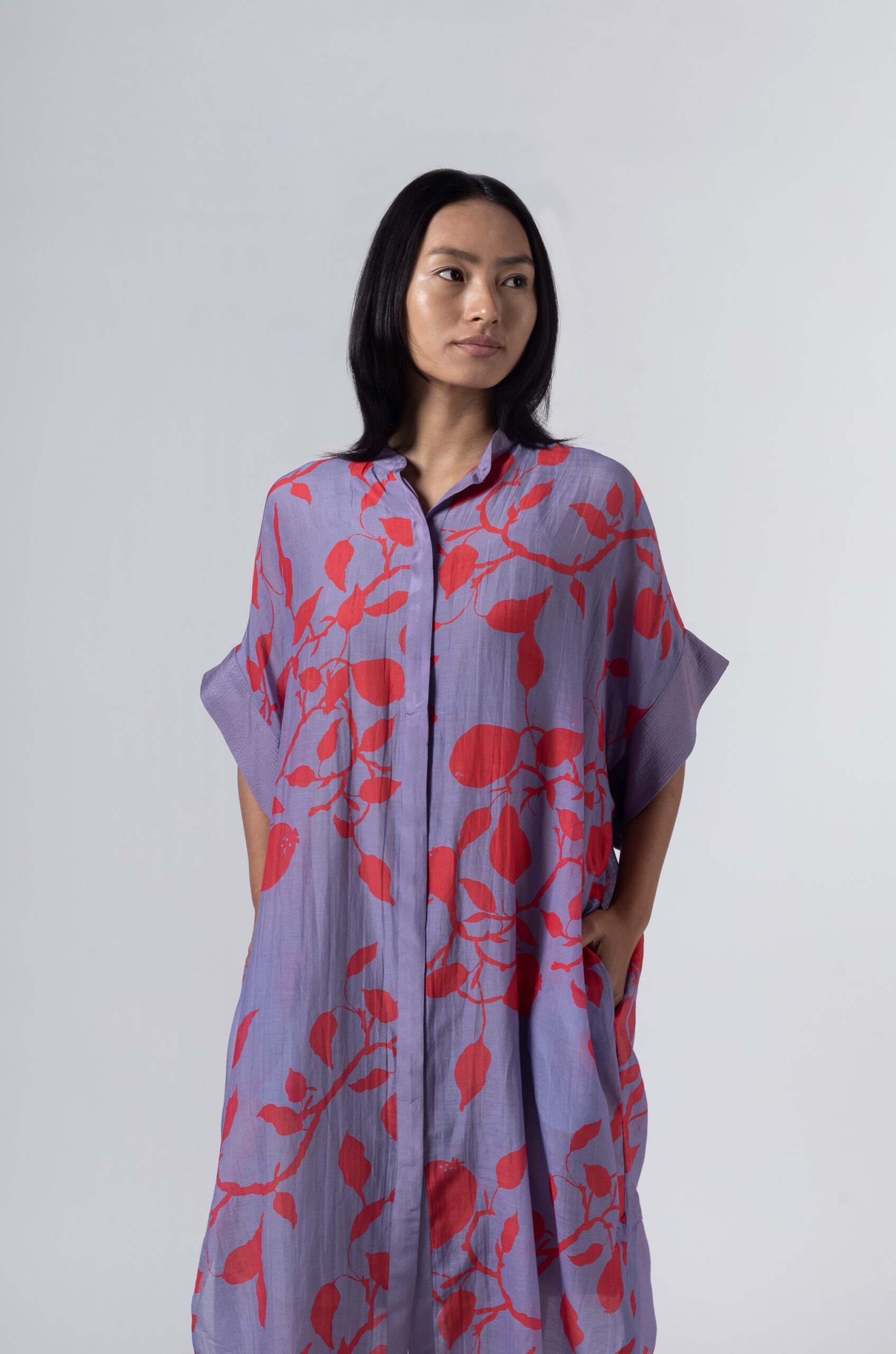 This kaftan features a stunning fruit-inspired pear print, silk collar, and placket, exuding elegance with a flowy fall for effortless sophistication.