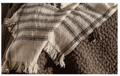 - Fusing elements of striking natural fibers such as Indian merino with local sheep wool, tussar silk and organic cotton using traditional weaving techniques from Western India, this throw bring-forth the felted richness along with shine and hand feel. Each piece is delicately finished with hand made tassels at the two ends and features minute hand embroidered motif.